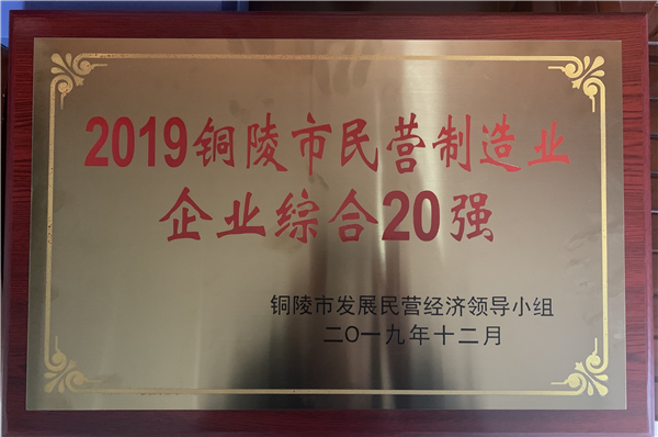 2019年12月30日,2019年銅陵市民營(yíng)企業(yè)50強(qiáng)等評(píng)選結(jié)果新聞發(fā)布會(huì)在市行政會(huì)議中心第五會(huì)議室召開。我公司榮獲“2019年銅陵市民營(yíng)制造業(yè)企業(yè)綜合20強(qiáng)”榮譽(yù)稱號(hào)。 按照企業(yè)申報(bào)、縣區(qū)初審、專家評(píng)審、領(lǐng)導(dǎo)小組審核...