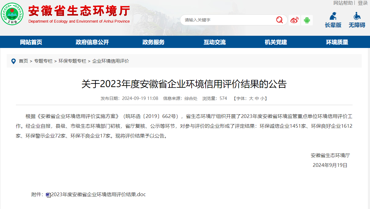 近日,從安徽省生態(tài)環(huán)境廳發(fā)布的關(guān)于2023年度安徽省企業(yè)環(huán)境信用評價結(jié)果公告中獲悉,公司獲評安徽省2023年度“環(huán)保誠信企業(yè)”。今年以來,公司全面落實企業(yè)環(huán)保主體責(zé)任,通過不斷完善環(huán)保管理制度、加強環(huán)保設(shè)施運...